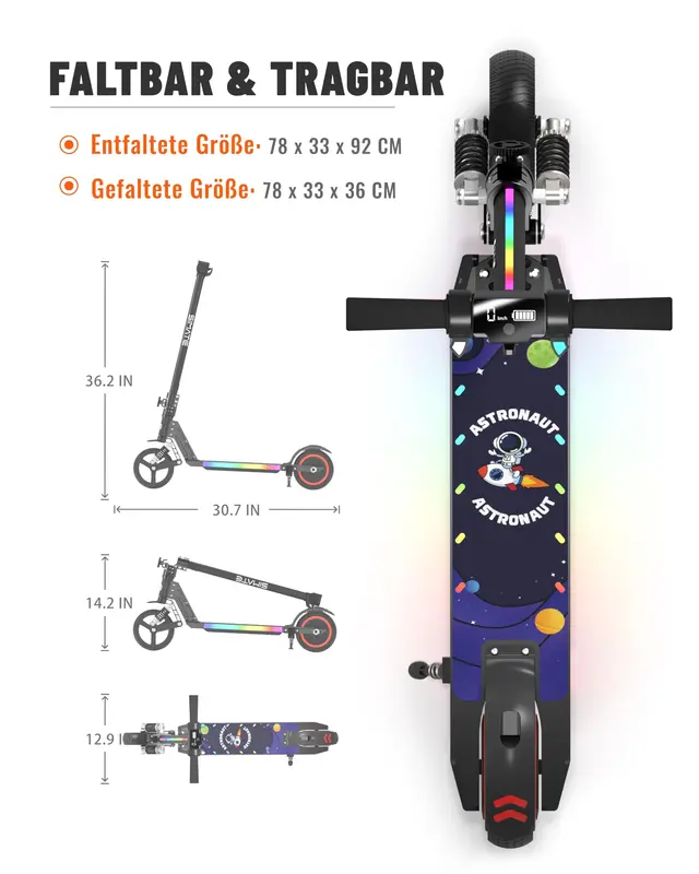 • Bunte LED-Lichter: Frontlicht & bunte Seitenbeleuchtung, dazu coole Sticker für einen trendigen Look.